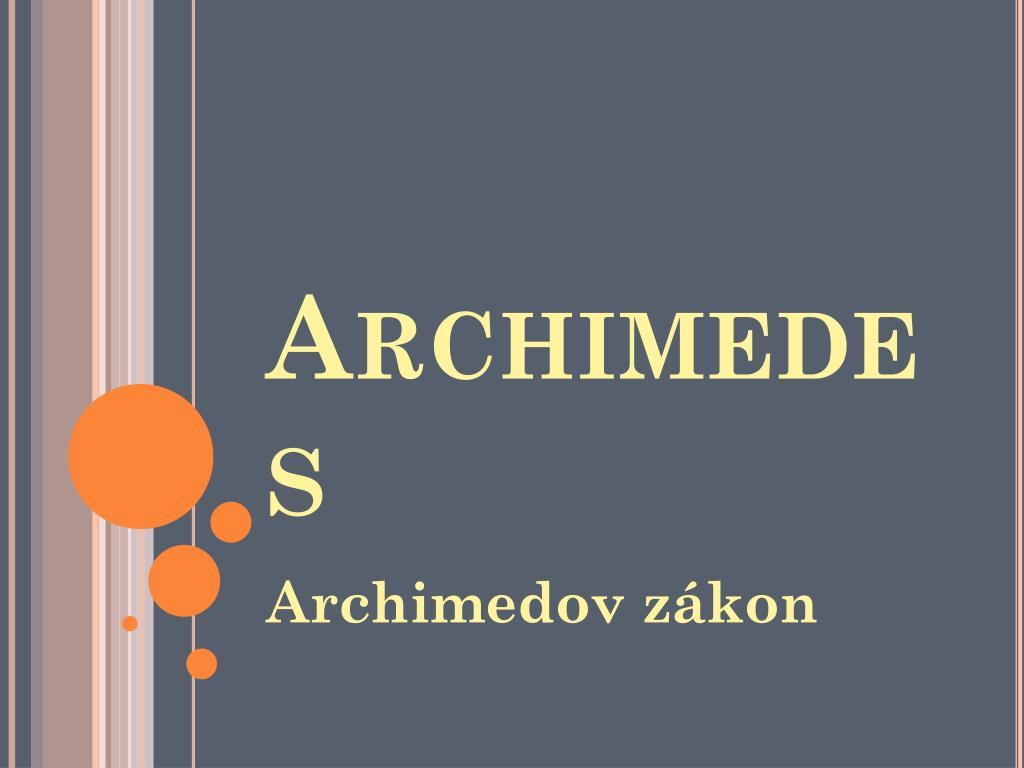 Archimédův zákon je možno vyjádřit i v matematickém tvaru: Kde v t je ponořený objem tělesa, ρ k … Archimédés ze syrakus žil v řecku před více než 2200 lety. Jako první dal dohromady závěr pozorování o souhře chování těles a kapaliny, do které se těleso ponořuje... Archimédův zákon budeme používat v tomto znění: