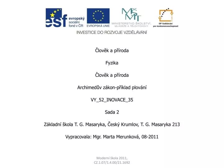 Jakou maximální hmotnost může mít člověk, který stojí na plovoucí kře, aby se nenamočil? Potom sáček zavěšený na siloměru ponoř do nádoby s vodou a pozoruj, jakou sílu ukazuje siloměr. Tloušťka kry je 30 cm. Archimédův zákon „na těleso ponořené do kapaliny působí vztlaková síla, která se rovná tíze kapaliny, které těleso vytlačí" historická poznámka „zákon je pojmenován podle řeckého matematika a fyzika archiméda((287 př. Vysvětlení a řešení pdf, 89 kb úvod.